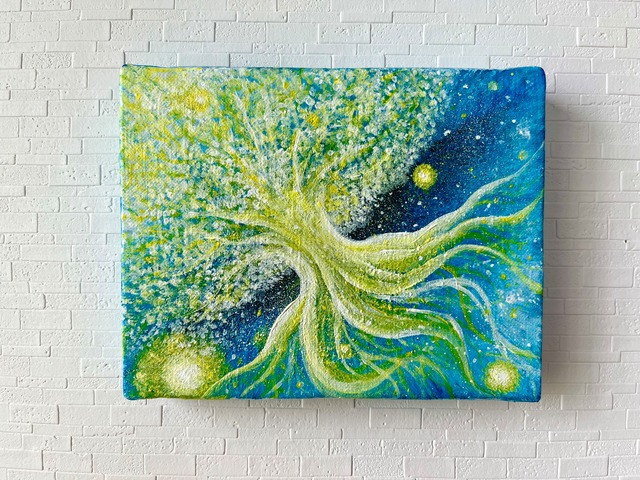 タイトル「神樹-shinju-」 夢の大樹は宇宙(ソラ)に浮かび、全ての人を照らす存在。 (作品情報) F0サイズ : 18×14cm アクリル画 / 原画1点もの ¥22,000(税込) ☆ココがポイント ▶︎大人の手のひらに乗るくらいの大きさなので、場所を選ばずどこでもお好きな場所に飾って頂けます♪ ▶︎ラジウム鉱石のパウダーを使用しているので、絵から森林浴と同じレベルのマイナスイオンが出ています。飾るだけで深呼吸が深まり、リラックス効果大♪ ▶︎世界にひとつしかないエネルギーたっぷりの原画が手に入るチャンス! ご縁ある方のもとへ繋がりましたら嬉しいです。 (発送方法) ヤマト宅急便にて大切にお届けいたします。額装はいたしませんが、予めご了承くださいませ。