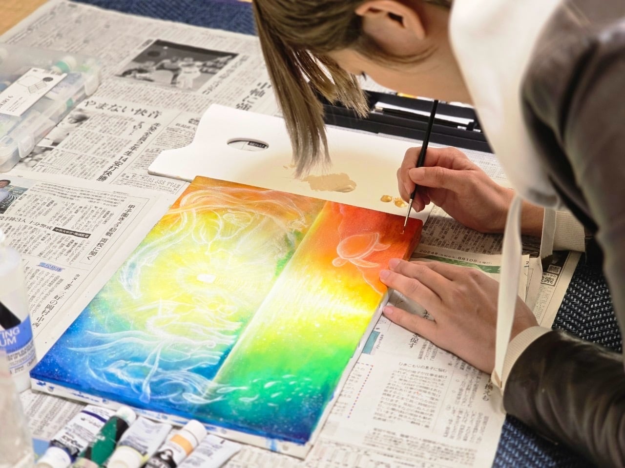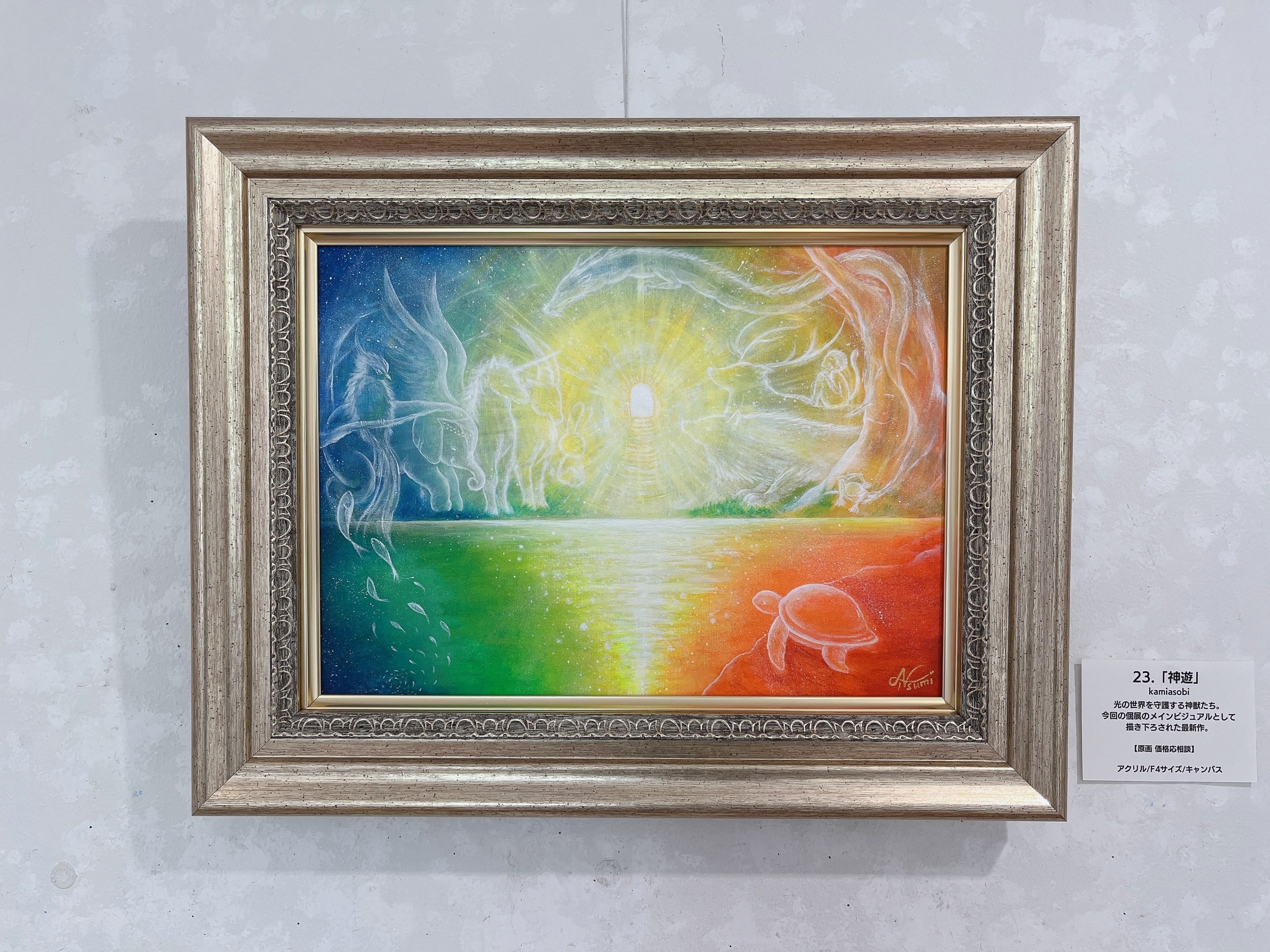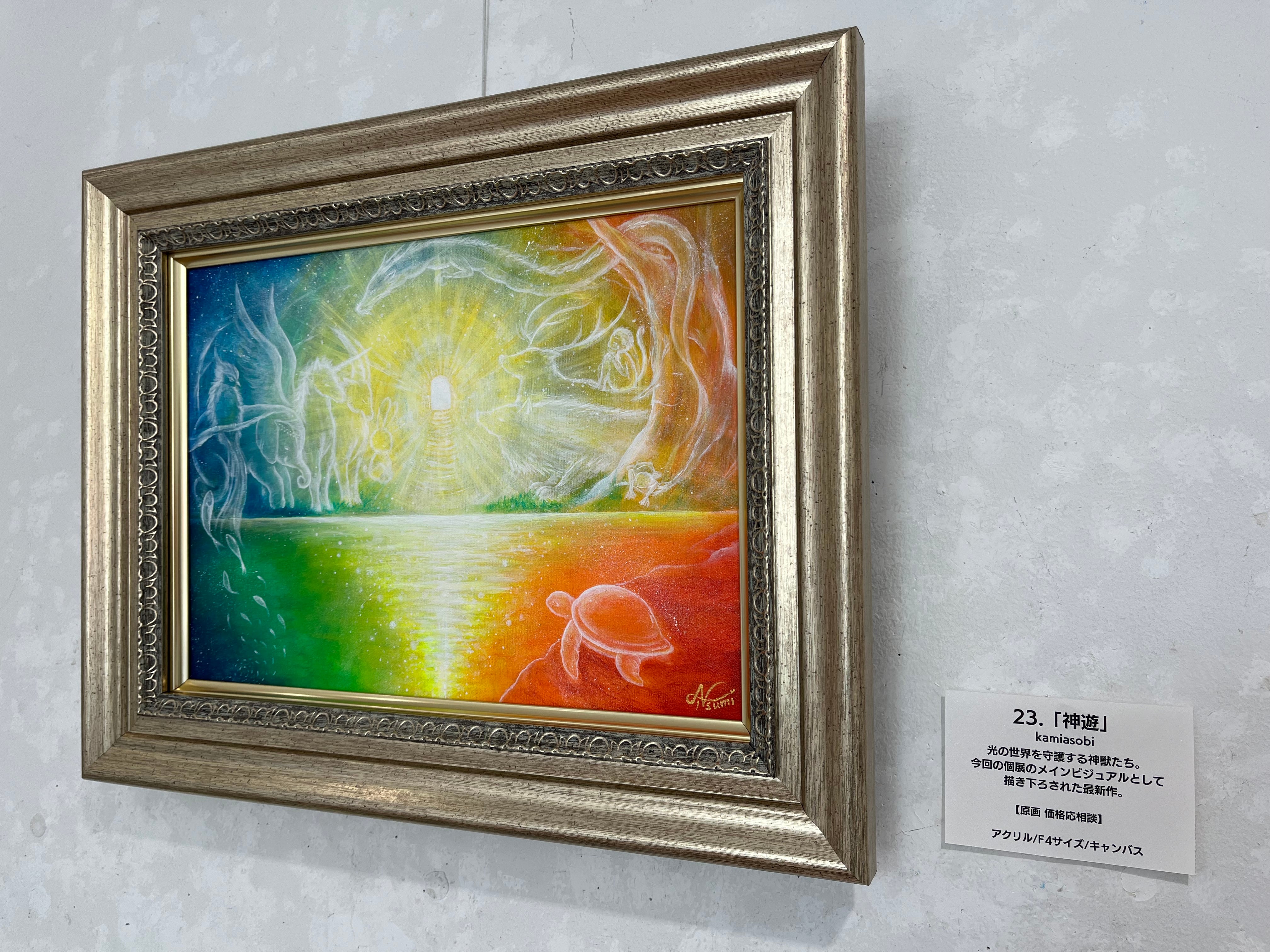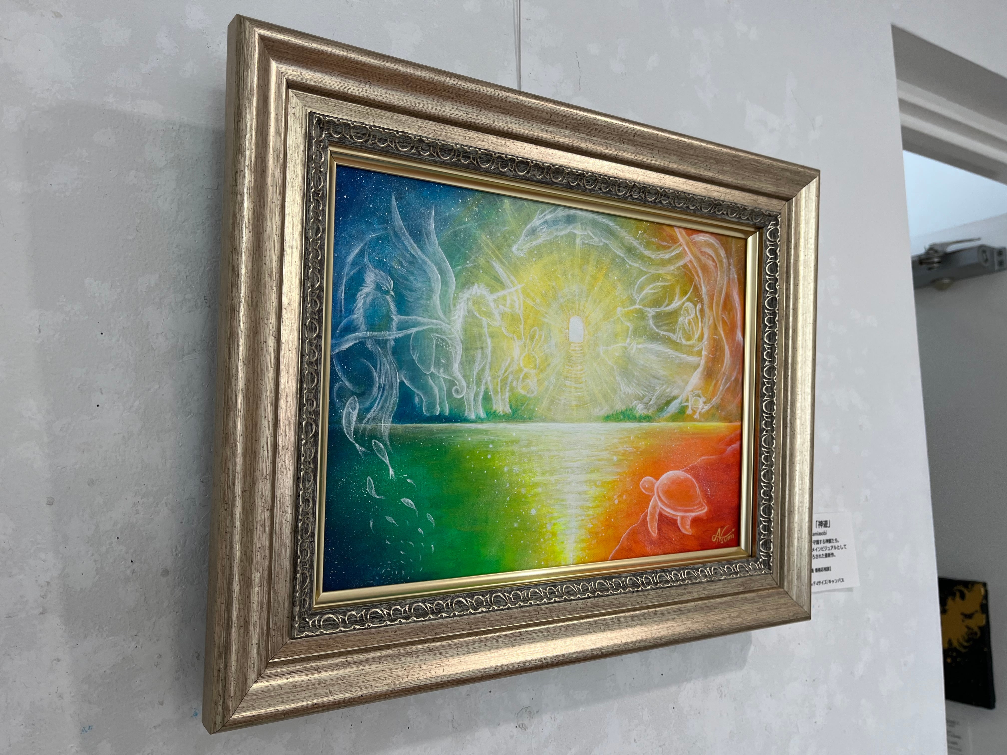 こちらは、2025年3月の個展「神遊-kamiasobi-」のメインビジュアルとして描かれた作品です。光の世界とこの世をつなぐ次元の扉の周りに、さまざまな神様たちが集っている様子を虹色の光で表現しました。