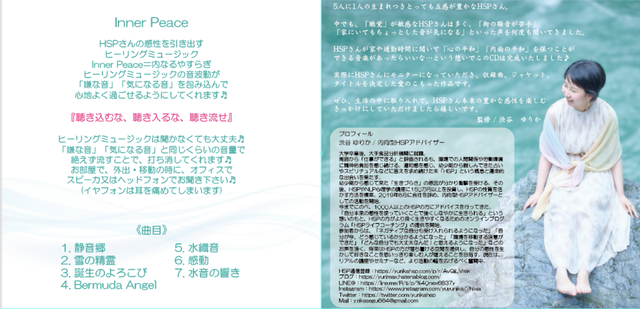内向型HSPアドバイザーの渋谷 ゆりかさんとの出合いからプロジェクトが企画された、HSPさんの感性を引き出すヒーリングミュージックCD「Inner Peace」が、誕生しました♬