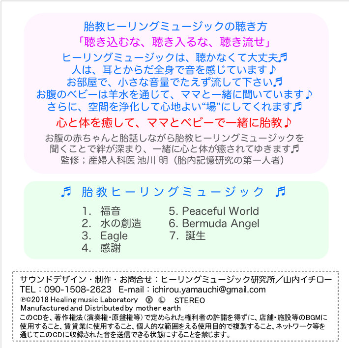 胎内記憶研究の第一人者の産婦人科医 池川明先生のご監修による、『胎教』のためのヒーリングミュージックCDが、ジャケット デザインをリニューアルして再リリース♬