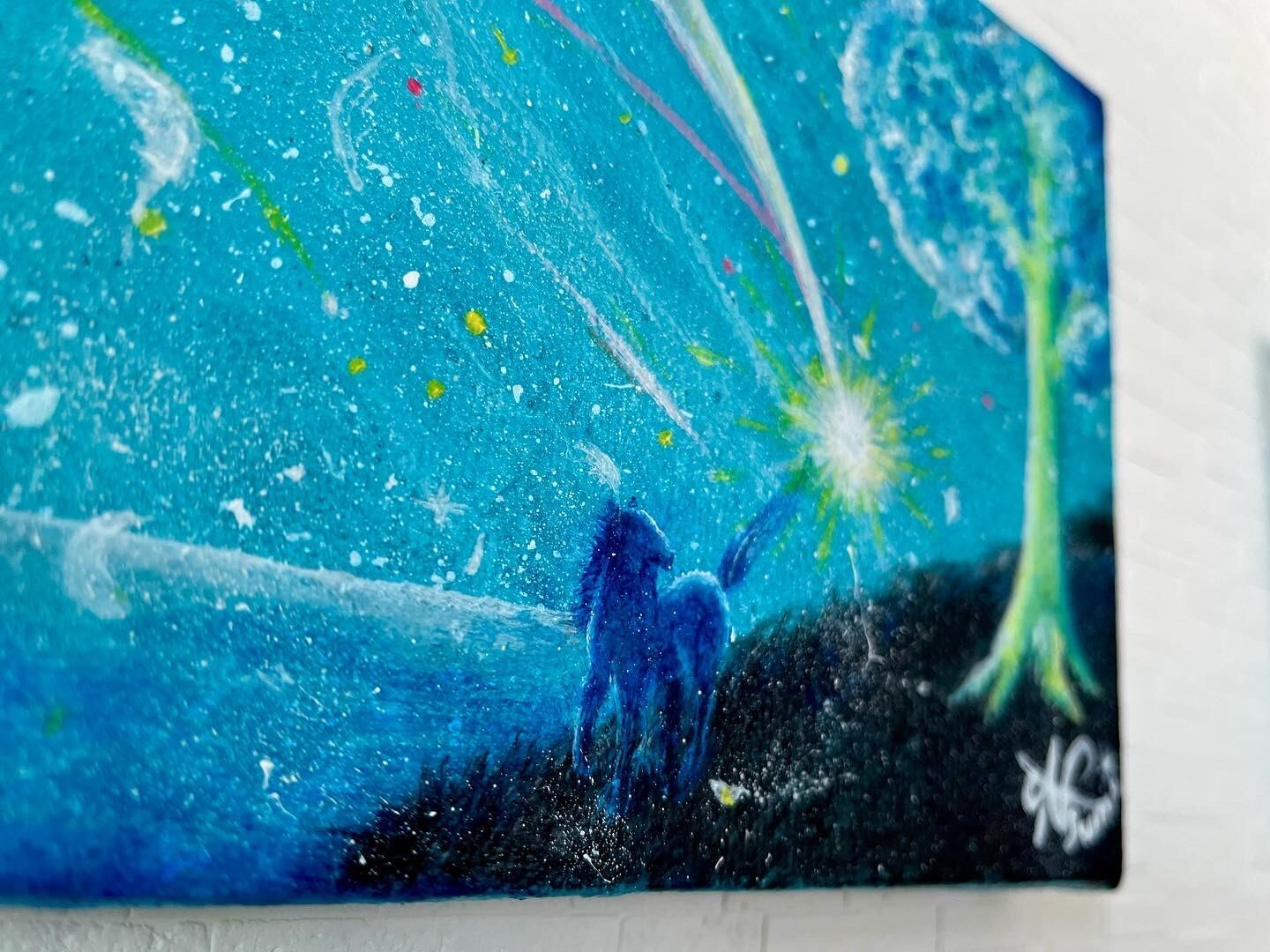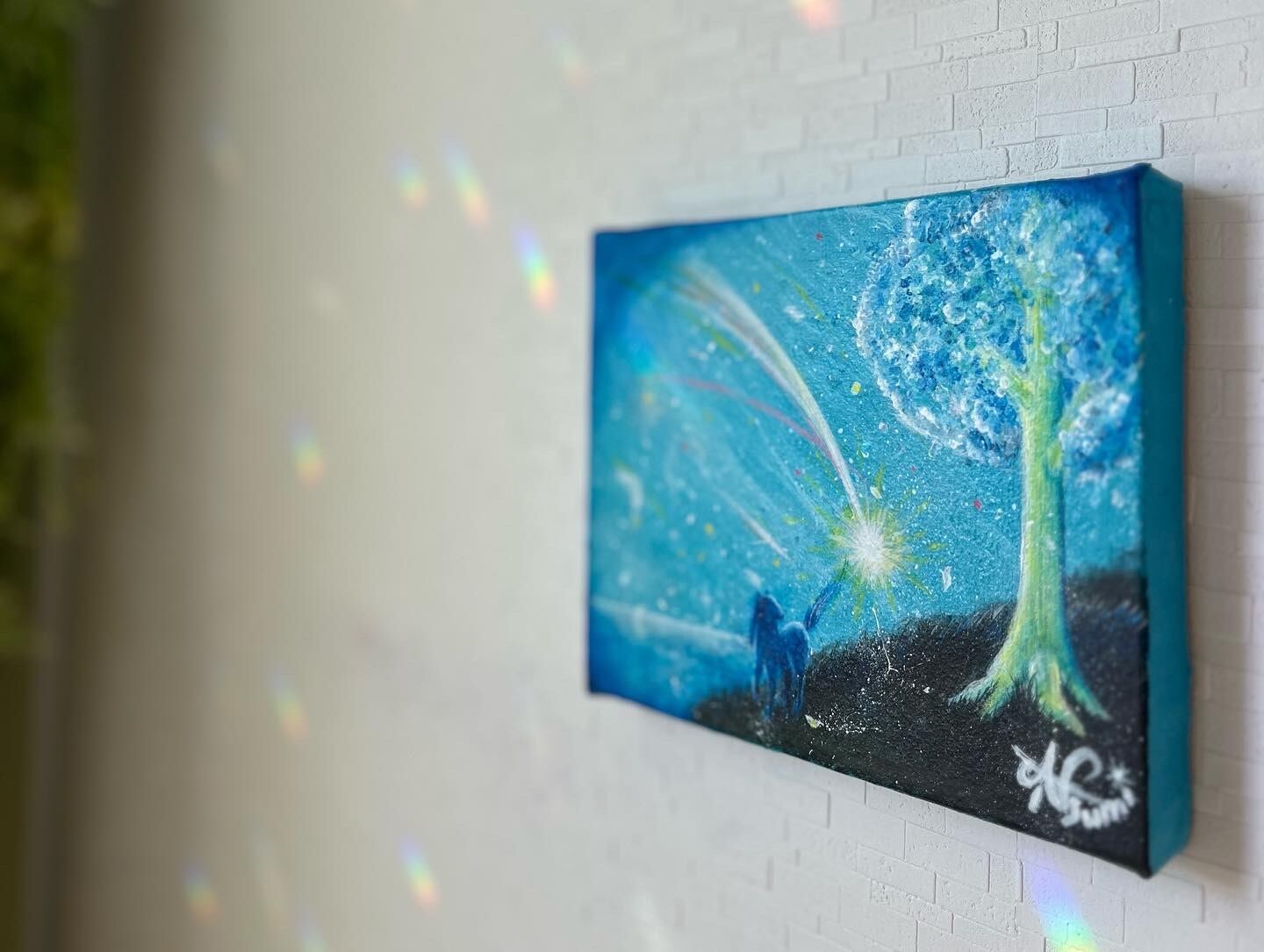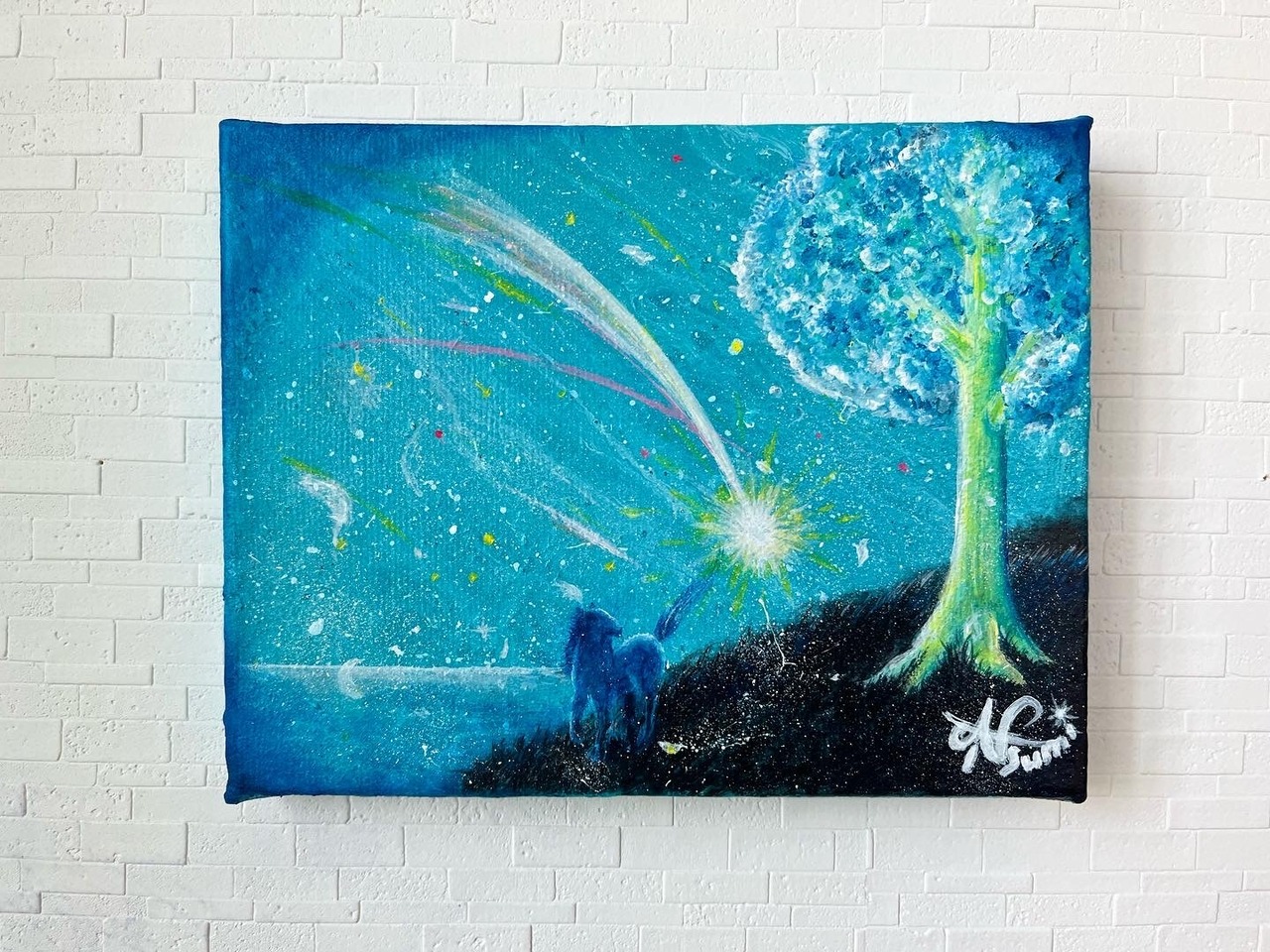 神社で願い事を書くものといえば?・・・そう、絵馬。絵に描かれた馬には、神様に願いを届けるというお役目があります。こちらの作品には、あなたの願いがスムーズに神様に届けらるようにと願いを込めて宇宙から降り注ぐチャンスの流れ星を描きました。